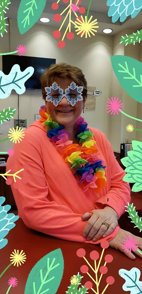Our science teacher Ms. Laith Vangrootenbruel, was decked out in Seasonal Tropical Wear in her Tropical colors & Lei with snowflake glasses