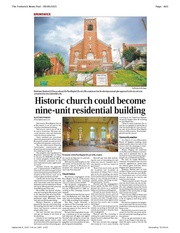 | 06:46, 9 September 2025 | Historic First Baptist Church could become nine-unit residential building, FrederickNewsPost, 2025.09.09,.pdf (file) | 3.58 MB | Wallgaier | Brunswick's First Baptist Church, which is more than 100 years old, to be repurposed into nine two-bedroom units for rent at market rate. Category:Revitalization | 1 | |