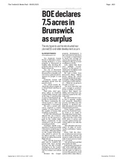 | 03:34, 6 September 2025 | BOE declares 7.5 acres in Brunswick as surplus, FrederickNewsPost, 2025.09.05.pdf (file) | 2.51 MB | Wallgaier | City of Brunswick hopes to acquire property to develop a 17-acre park next to Cooper property development. Category:City of Brunswick | 1 | |