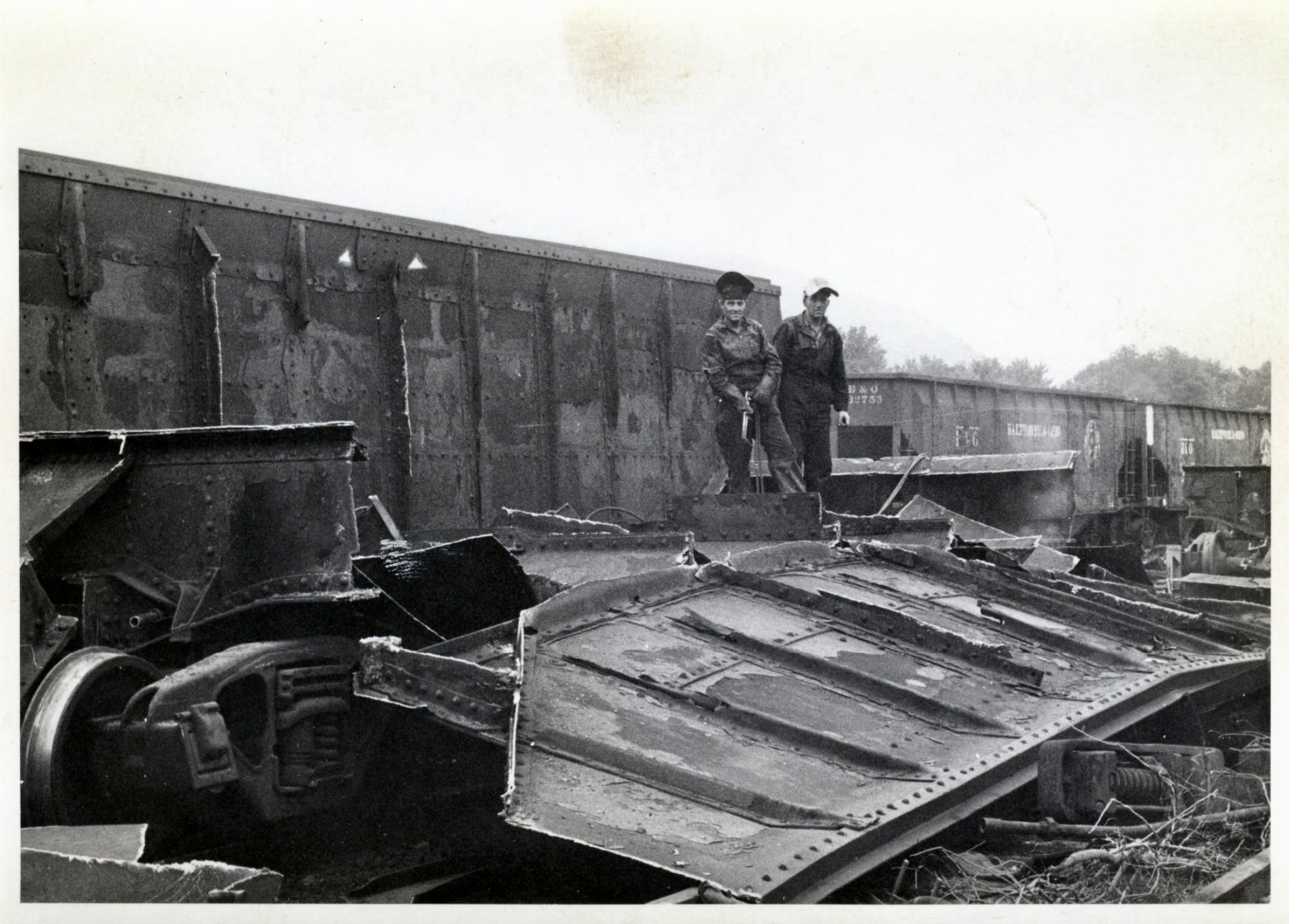 Two railroaders pose while working in the scrap yard, which was located just beyond the car yard's west end. The man on the right is believed to have been Jay Main. Photo possibly from the late 1960s.