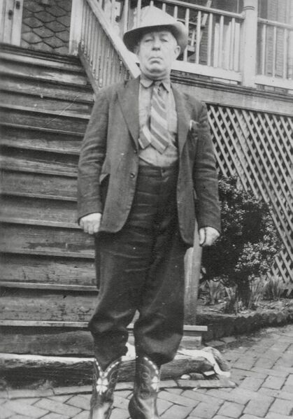 Dr. JGF Smith shows off a new pair of cowboy boots, likely outside his back porch in the 1940s.