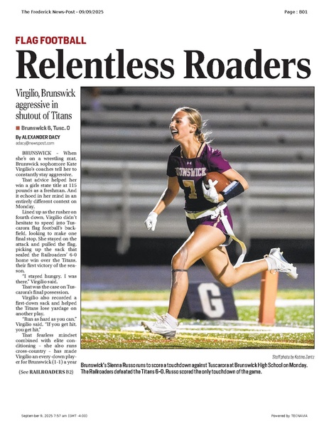 Brunswick girls flag football team beats Tuscarora. Sophomore Kate Virgilio is highlighted.