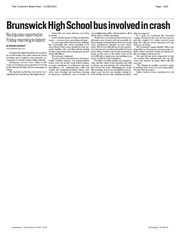 | 08:12, 8 December 2025 | Brunswick High School bus involved in crash, FrederickNewsPost, 2025.12.06.pdf (file) | 2.12 MB | Icy roads resulted in an accident involving a school bus with high school students. No injuries. Category:High School | 1 | |